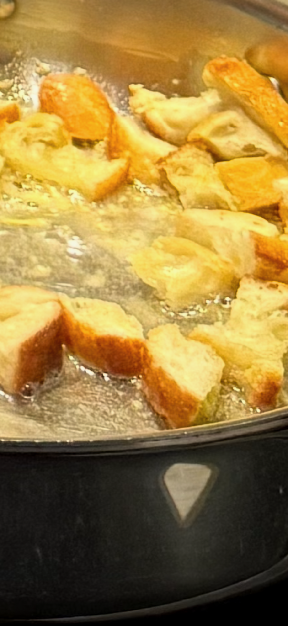 melt butter together with olive oil in large skillet. sauté garlic until soft but do not brown. Put cubes of bread in skillet over medium high heat tossing and browning until they are thoroughly coated and toasted on all sides. Sprinkle with coarse sea salt and toss while still in pan. Remove croutons to paper towels and sprinkle with herbs. They will keep for several days in ziploc baggy or freeze until ready to use!